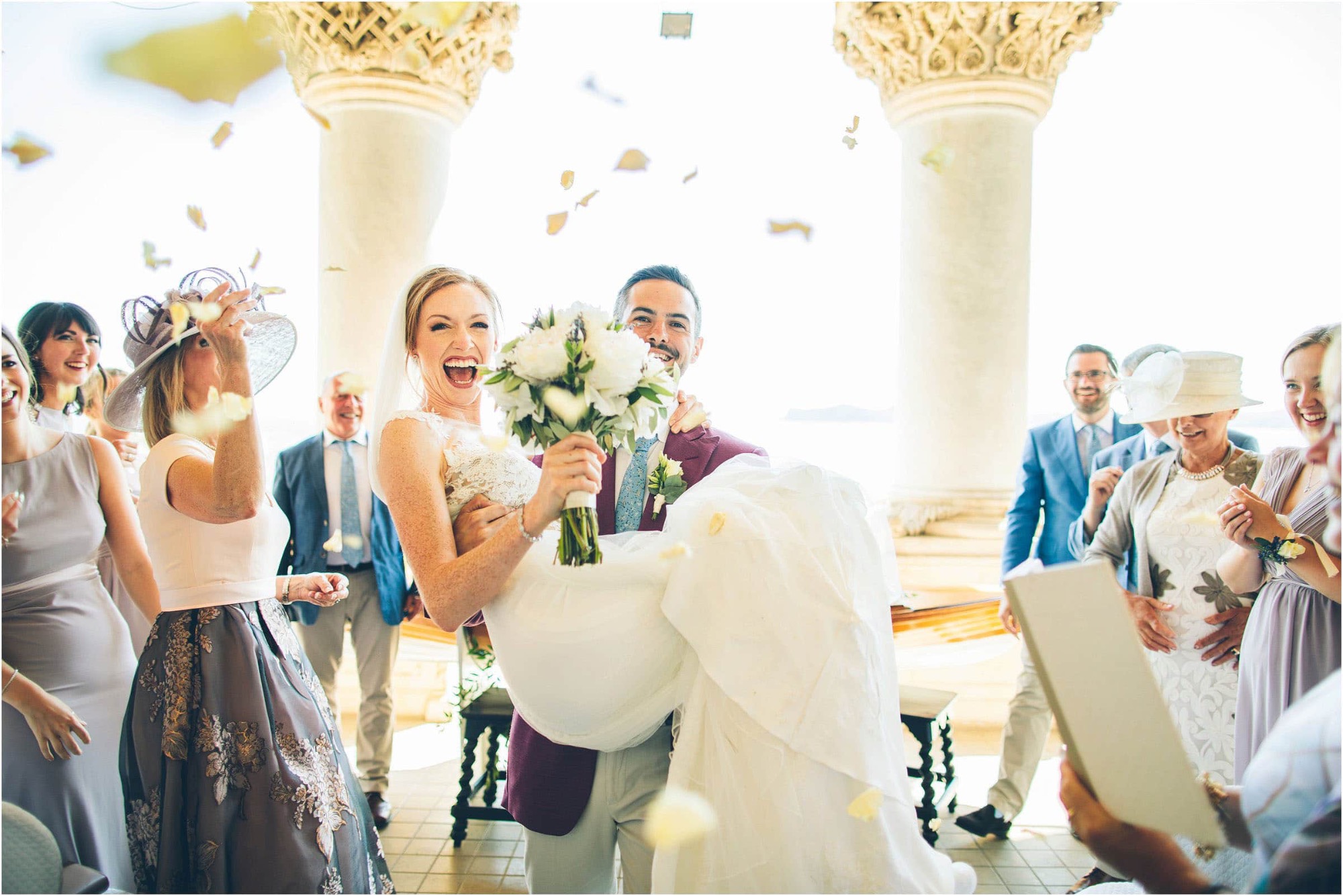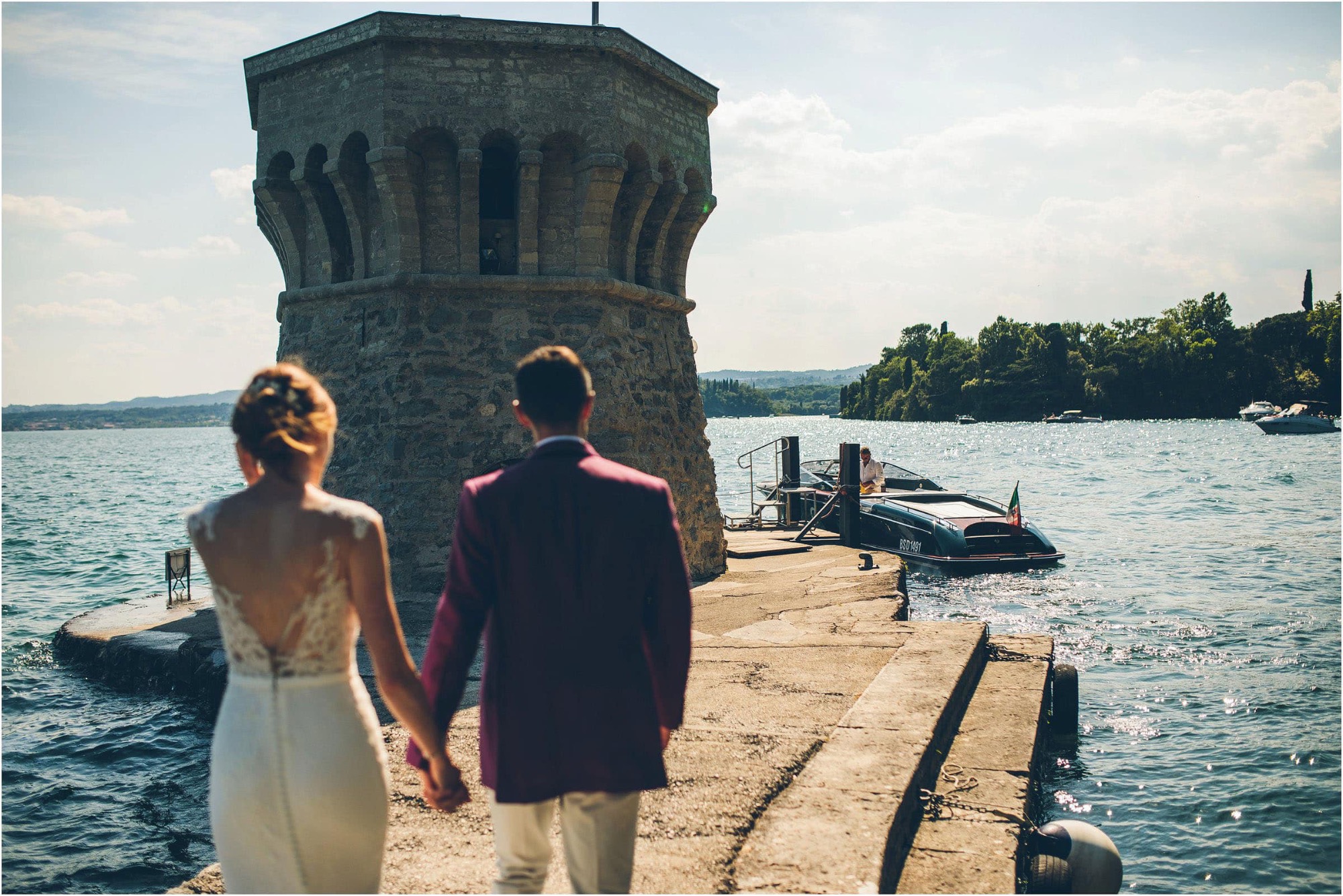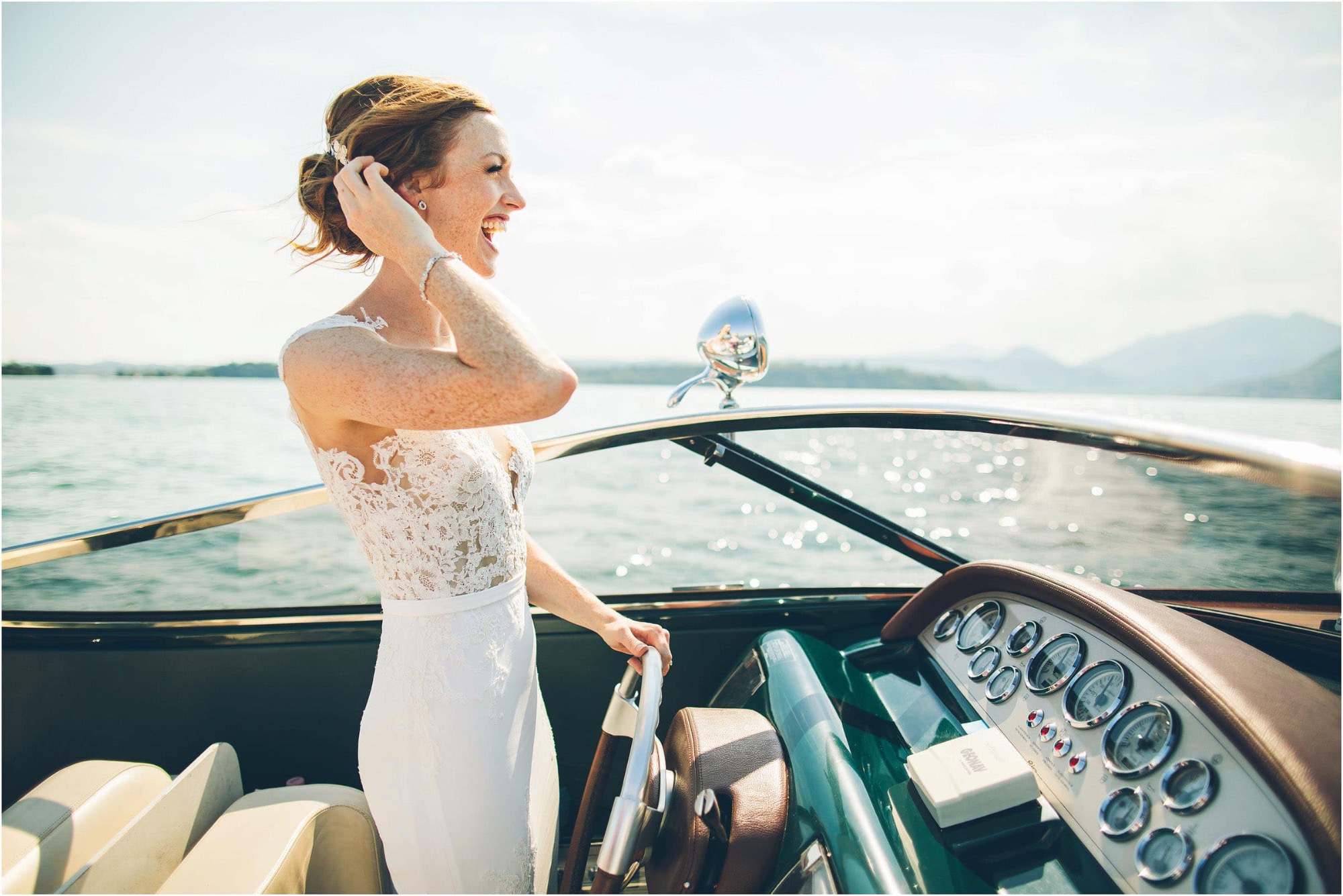 Dopo la cerimonia, la coppia non poteva che scegliere l’acqua come simbolo del loro spirito libero. A bordo di un elegante motoscafo Riva, Chloe e Peter hanno solcato le onde. Chloe, al timone, rideva mentre Peter la stringeva in un abbraccio, come due protagonisti di un film d’amore italiano. Ho immortalato la loro complicità in una serie di ritratti dinamici che raccontano la libertà e la gioia di vivere.