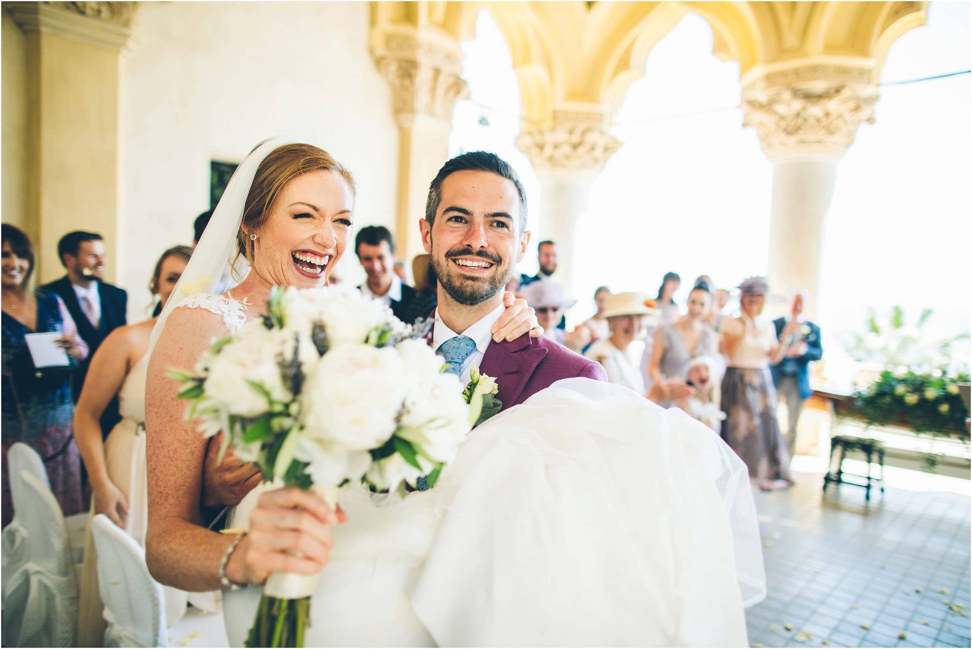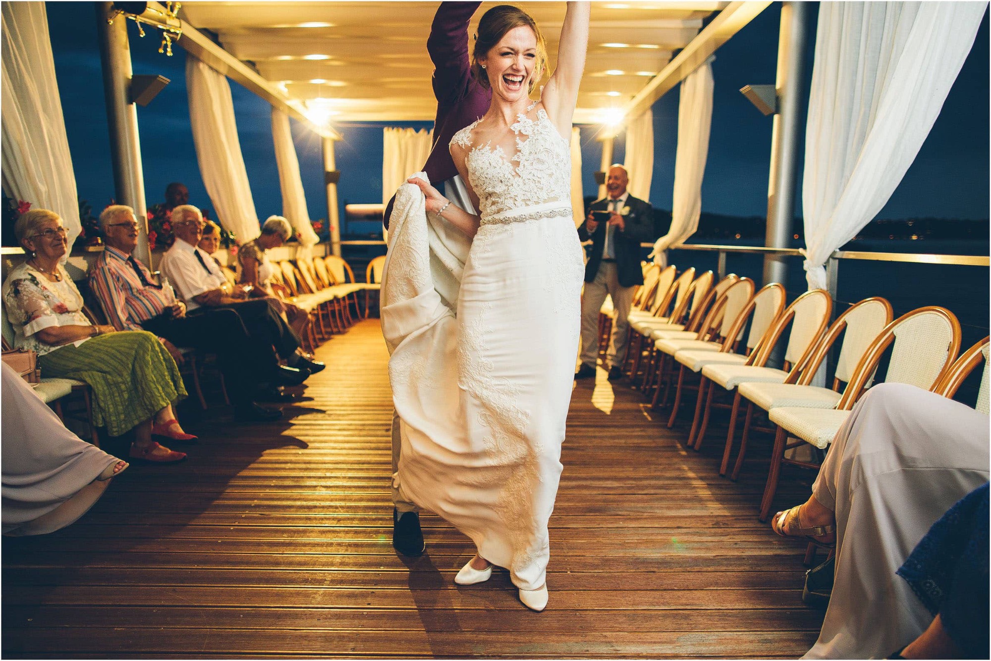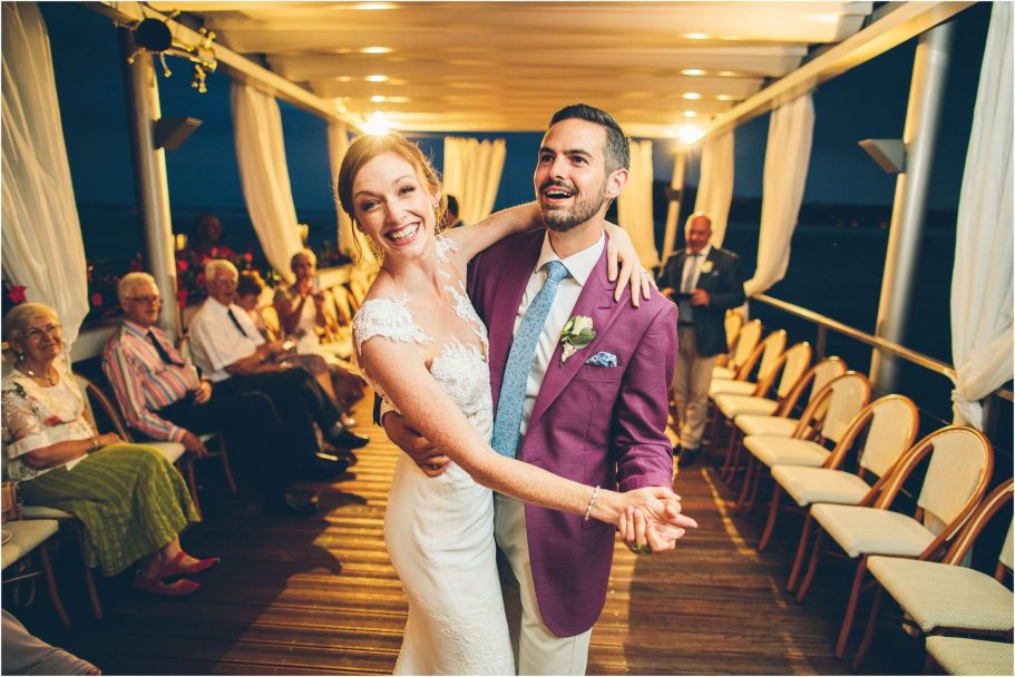 Dopo la cerimonia, la coppia non poteva che scegliere l’acqua come simbolo del loro spirito libero. A bordo di un elegante motoscafo Riva, Chloe e Peter hanno solcato le onde. Chloe, al timone, rideva mentre Peter la stringeva in un abbraccio, come due protagonisti di un film d’amore italiano. Ho immortalato la loro complicità in una serie di ritratti dinamici che raccontano la libertà e la gioia di vivere.
